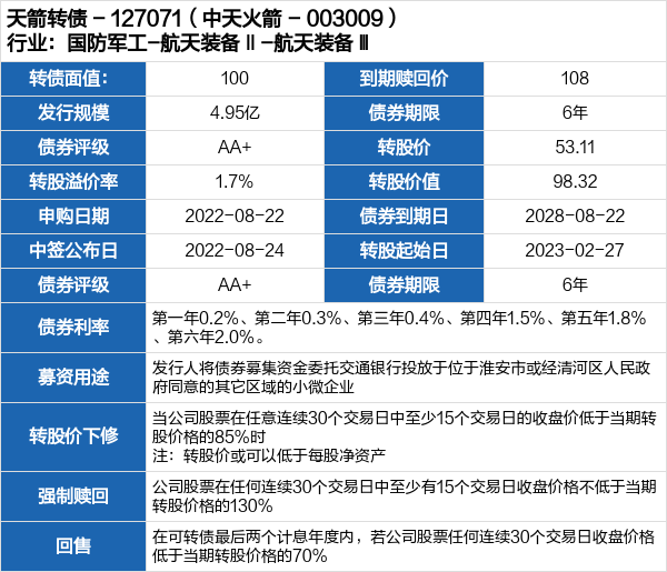 天箭转债本次债券融资规模为4.95亿。本次发行规模较小,可转债规模越大流动性越好。