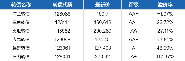 当前天箭转债溢价率 = 100% *(债券面值 / 转股价值 - 1) = 100% *(100 / 98.32 - 1) = 1.7%。结合行业、评级等因素后筛选出如下相似转债: