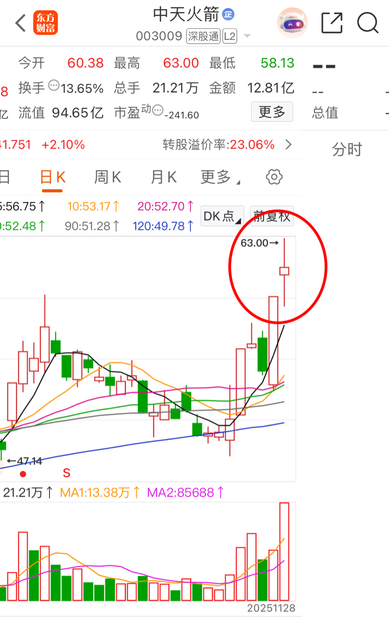 $中天火箭(SZ003009)$ 中字K线战法,过了63前高离秒板不远!#复盘记录#