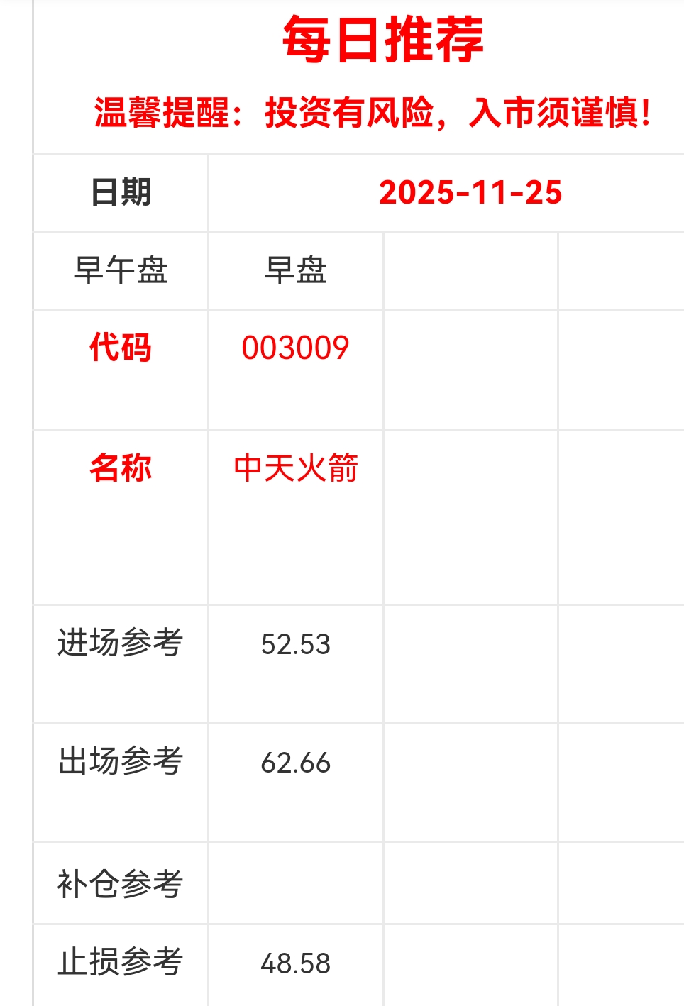 今日关注$中天火箭(SZ003009)$ 上个月25号我们分享并且达成位置目标,今天回调有寻找机会再进场,目前短线盘中买阴不买阳(回调买入,不要追高),买入参考点位关注App更新,个人观点,切勿盲目跟随,