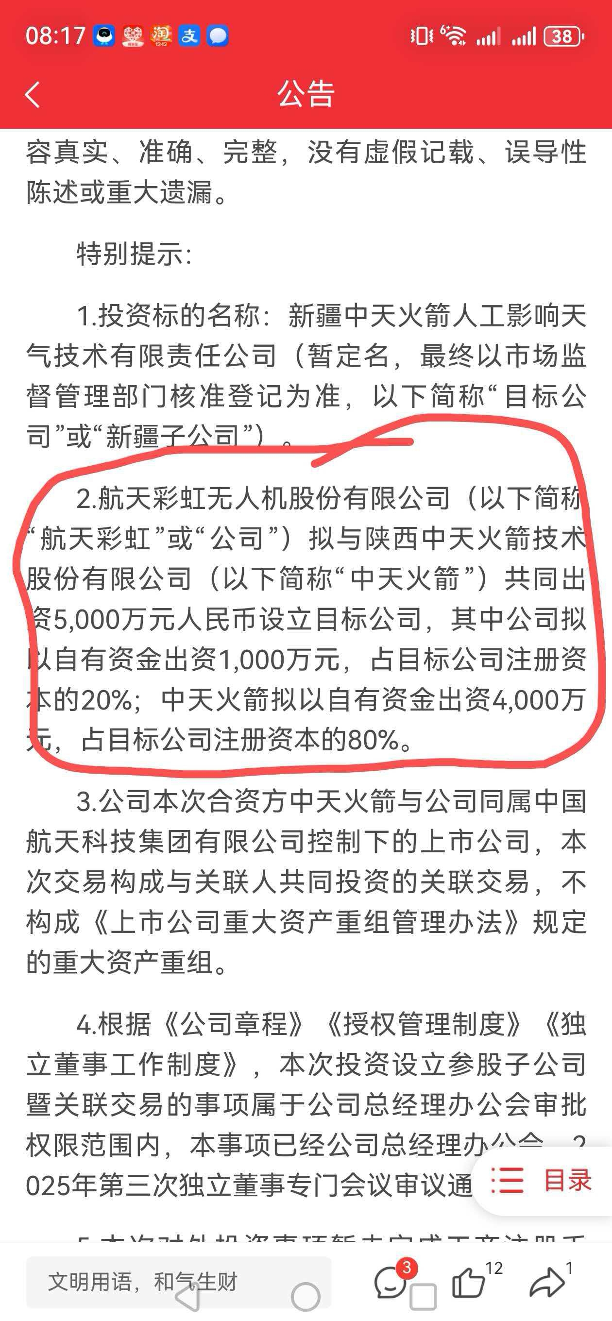今天这个利好,一定有阴谋,为什么航天彩虹出资1000万占20%都出公告了,你出资