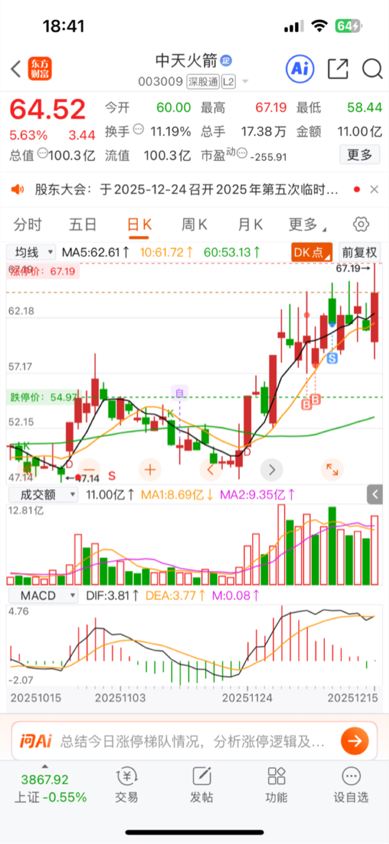 $中天火箭(SZ003009)$ 上窜下跳,还好跑得早,