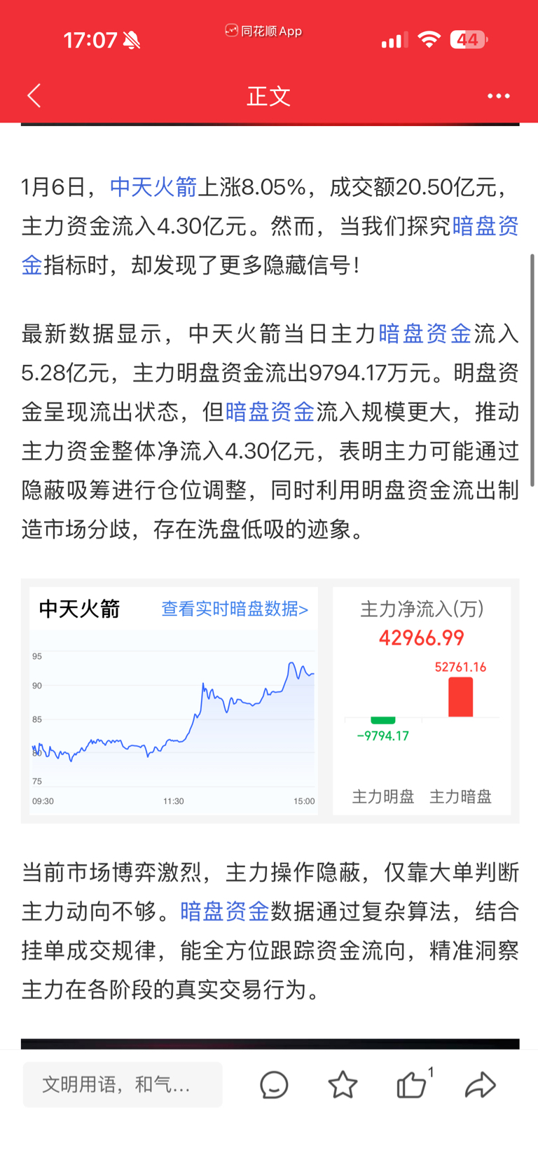 $中天火箭(SZ003009)$ 暗盘流入5.3亿。明天突破100