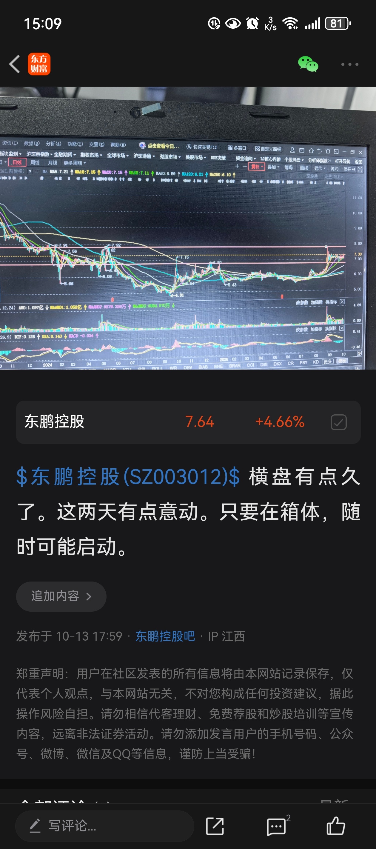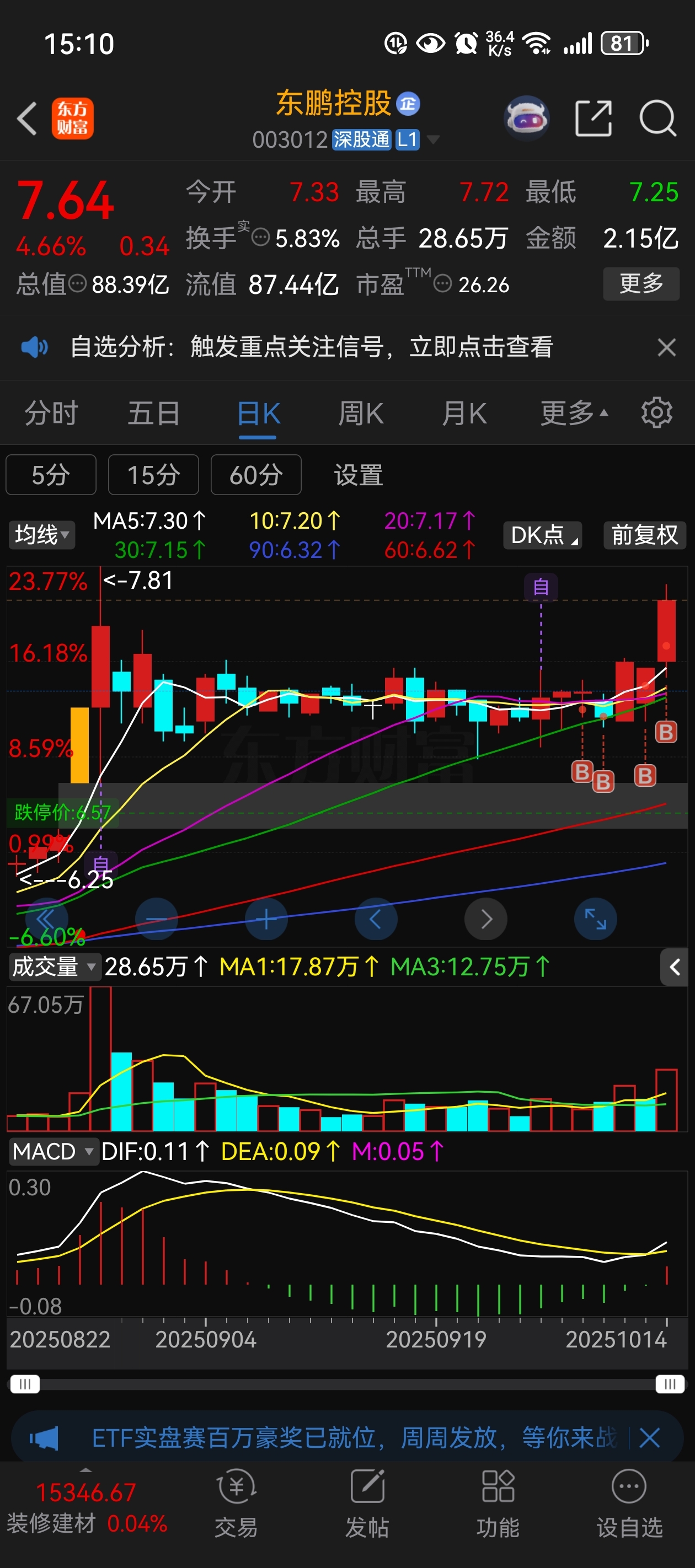 $东鹏控股(SZ003012)$ 昨天刚说会有意动,没想到今天就来了。明天大概率会走缩量调整,这样走势才更健康。如果走大阳线,注意不要追高。