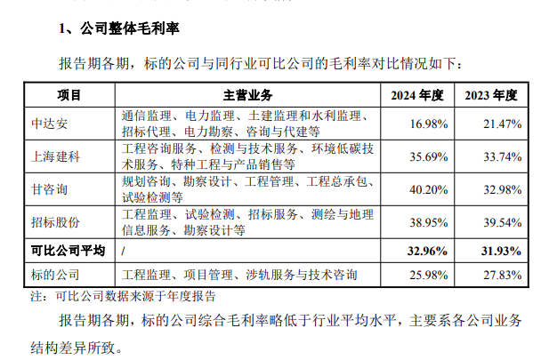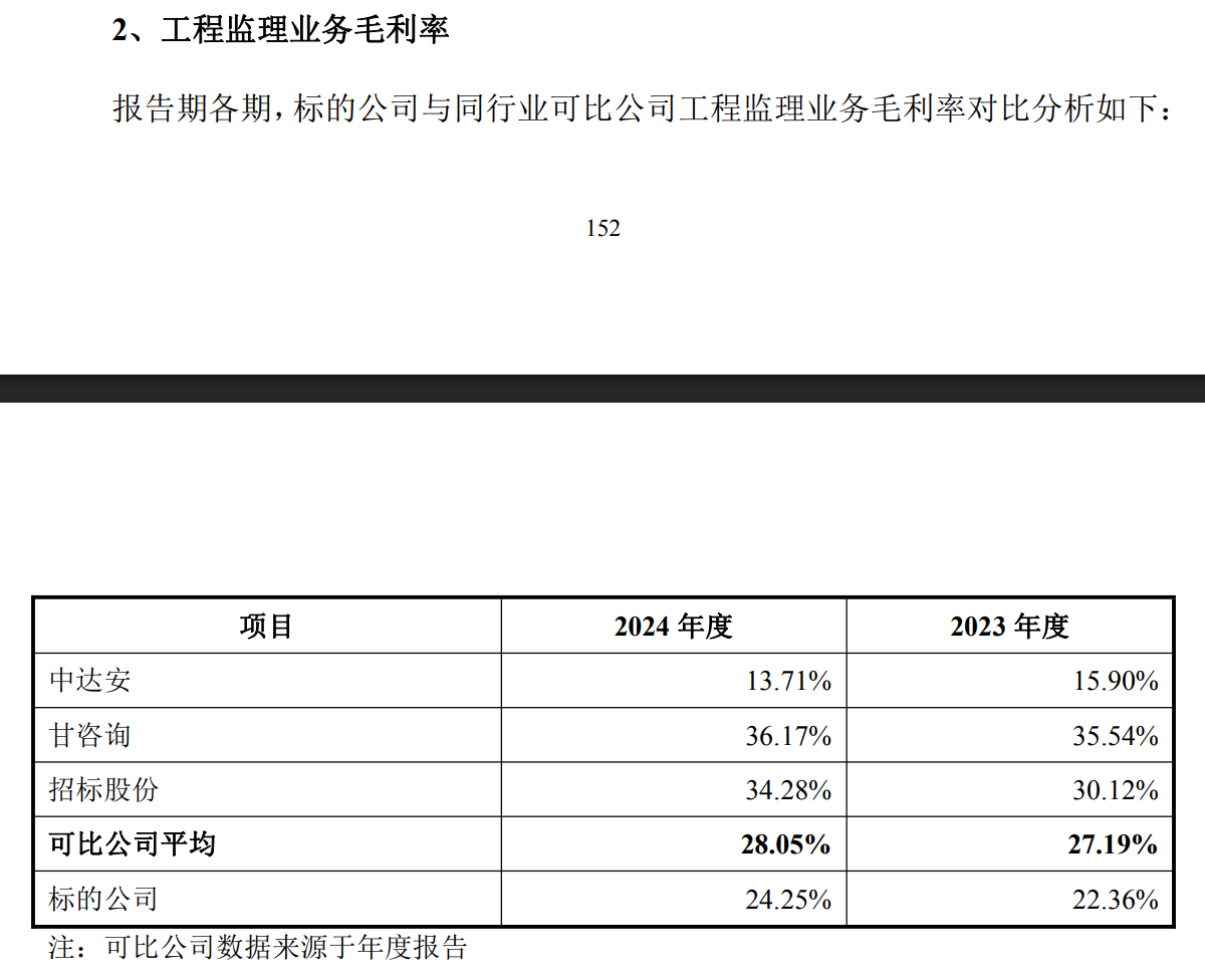 从各板块分析来看,2023年、2024年工程咨询公司的工程监理业务毛利率分别为22.36%、24.25%,同样低于可比公司平均水平的27.19%、28.05%。若排除主要集中于房屋建筑和市政工程的中达安,工程咨询公司则是“垫底”。