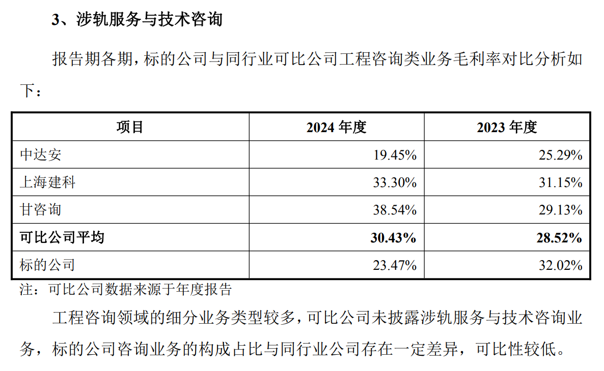 涉轨服务与技术咨询业务方面,数据显示,2023年、2024年工程咨询公司该业务的毛利率分别为32.02%、23.47%,可比公司平均水平为28.52%、30.43%。