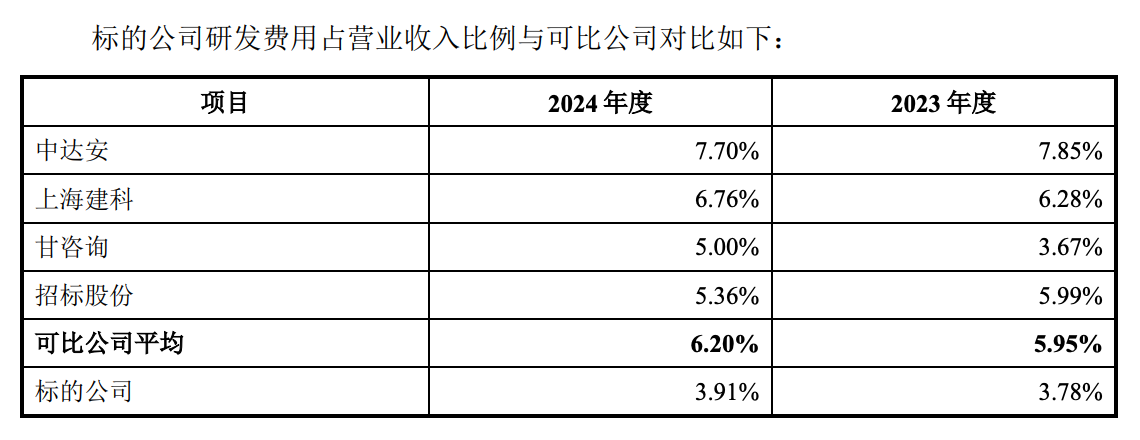 工程咨询公司的研发费用占比同样在可比公司中处于低位。公告显示,2023年、2024年,工程咨询公司研发费用分别为1565.60万元和1703.39万元,占当期营业收入的比例分别为3.78%和3.91%,同期可比公司平均研发费用占营业收入比例为5.95%、6.20%。