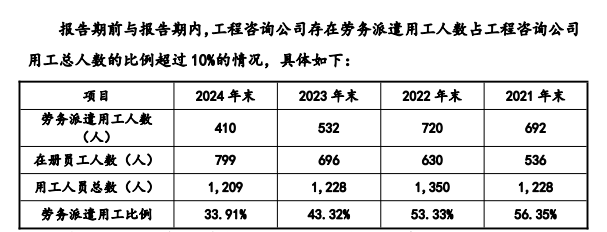 截至2025年4月末,工程咨询公司才“擦线”合规。公告显示,工程咨询公司劳务派遣用工人数为98人,在册员工人数为911人,用工人员总数为1009人,劳务派遣用工比例为9.71%。