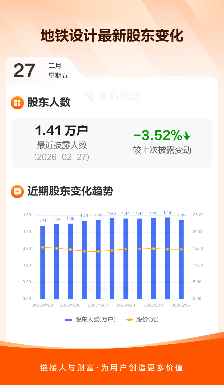 地铁设计:截至2月27日最新股东户数1.41万户,较上期减少3.52%