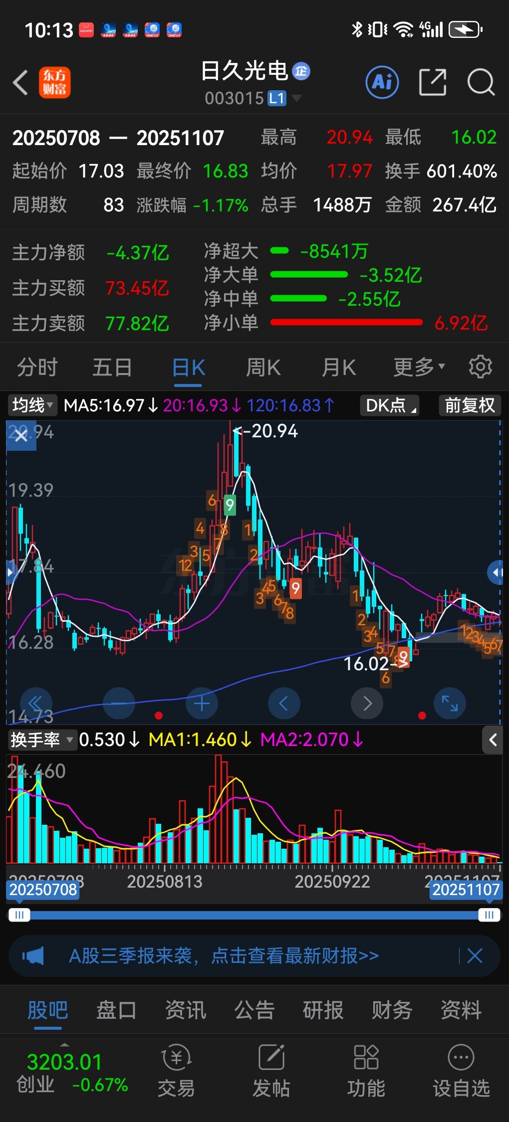 $日久光电(SZ003015)$ 股价从20.94前期高点经过三浪下跌,调整到位。应该有一波像样的反弹了!
