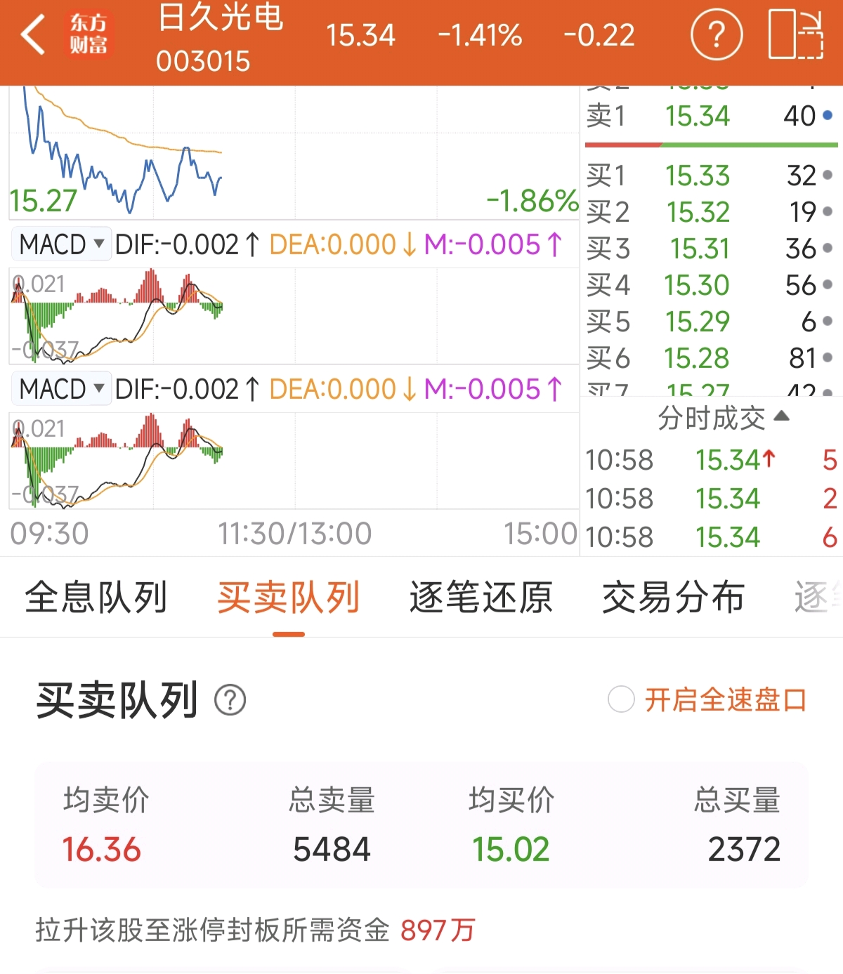 $日久光电(SZ003015)$ 没得人玩咯,拉涨停只要800多万。