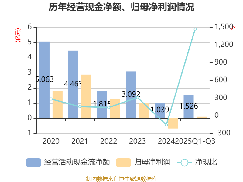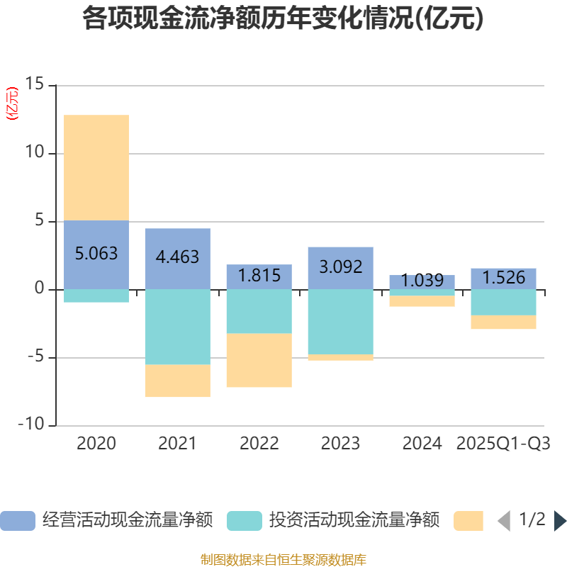 2025年前三季度,公司经营活动现金流净额为1.53亿元,同比增长551.27%;筹资活动现金流净额-1.01亿元,同比减少7530.57万元;投资活动现金流净额-1.92亿元,上年同期为-6359.35万元。