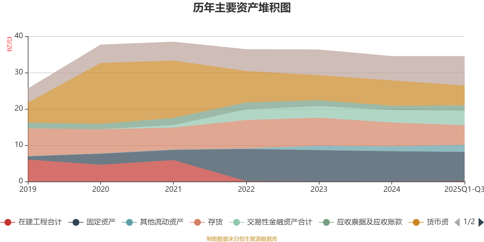 资产重大变化方面,截至2025年三季度末,公司货币资金较上年末减少22.18%,占公司总资产比重下降4.51个百分点;存货较上年末减少17.42%,占公司总资产比重下降3.31个百分点;一年内到期的非流动资产占公司总资产的2.18%,上年末为0;使用权资产较上年末增加95.75%,占公司总资产比重上升2.1个百分点。