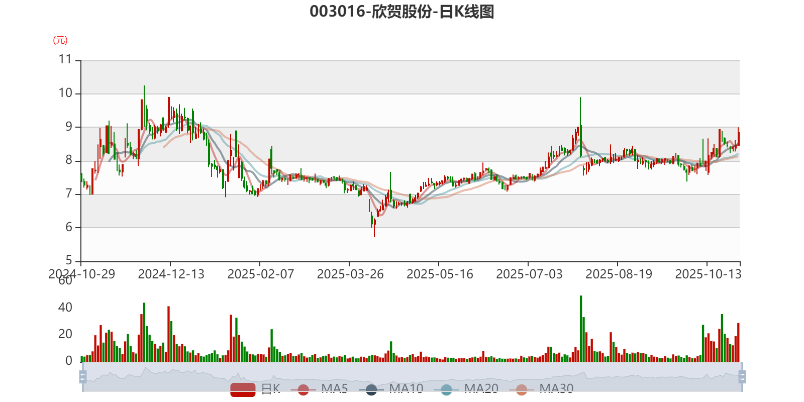 中证智能财讯欣贺股份(003016)10月29日披露2025年第三季度报告。前三季度公司实现营业总收入10.55亿元,同比增长3.65%;归母净利润1037.68万元,同比扭亏;扣非净利润亏损142.91万元,上年同期亏损3709.32万元;经营活动产生的现金流量净额为1.53亿元,同比增长551.27%;报告期内,欣贺股份基本每股收益为0.0248元,加权平均净资产收益率为0.39%。