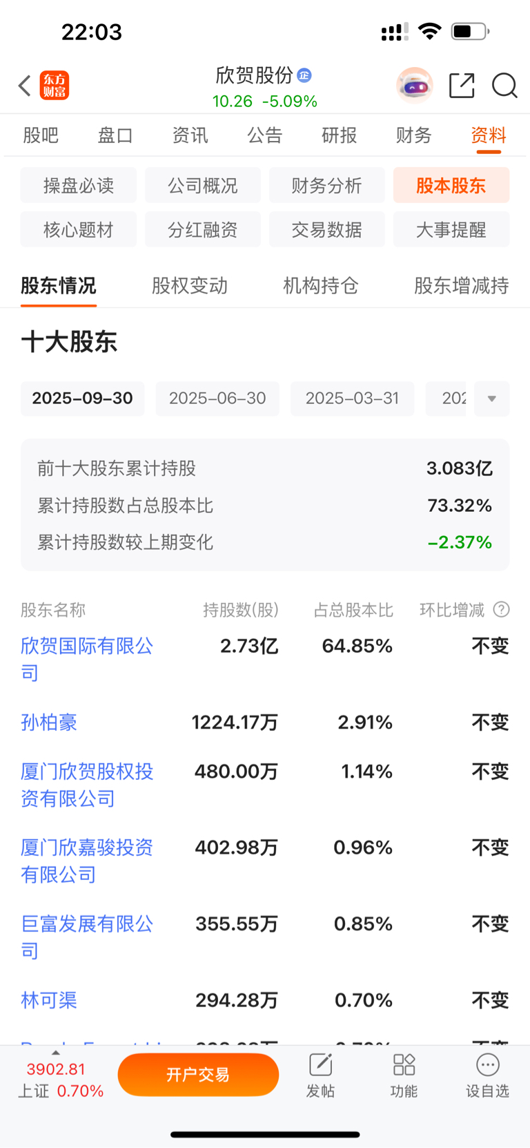 $欣贺股份(SZ003016)$ 公司前10大股东控制了百分之73的股份,也就是公司在流通的股份满1个亿股,结合股价市值也就10个亿,今天放了天量成交了6.2亿,其真实换手率应该大于60了,那都换了谁进来又换了谁出去?我觉得应该是主力把散户换进去站岗了,下周还要继续跌