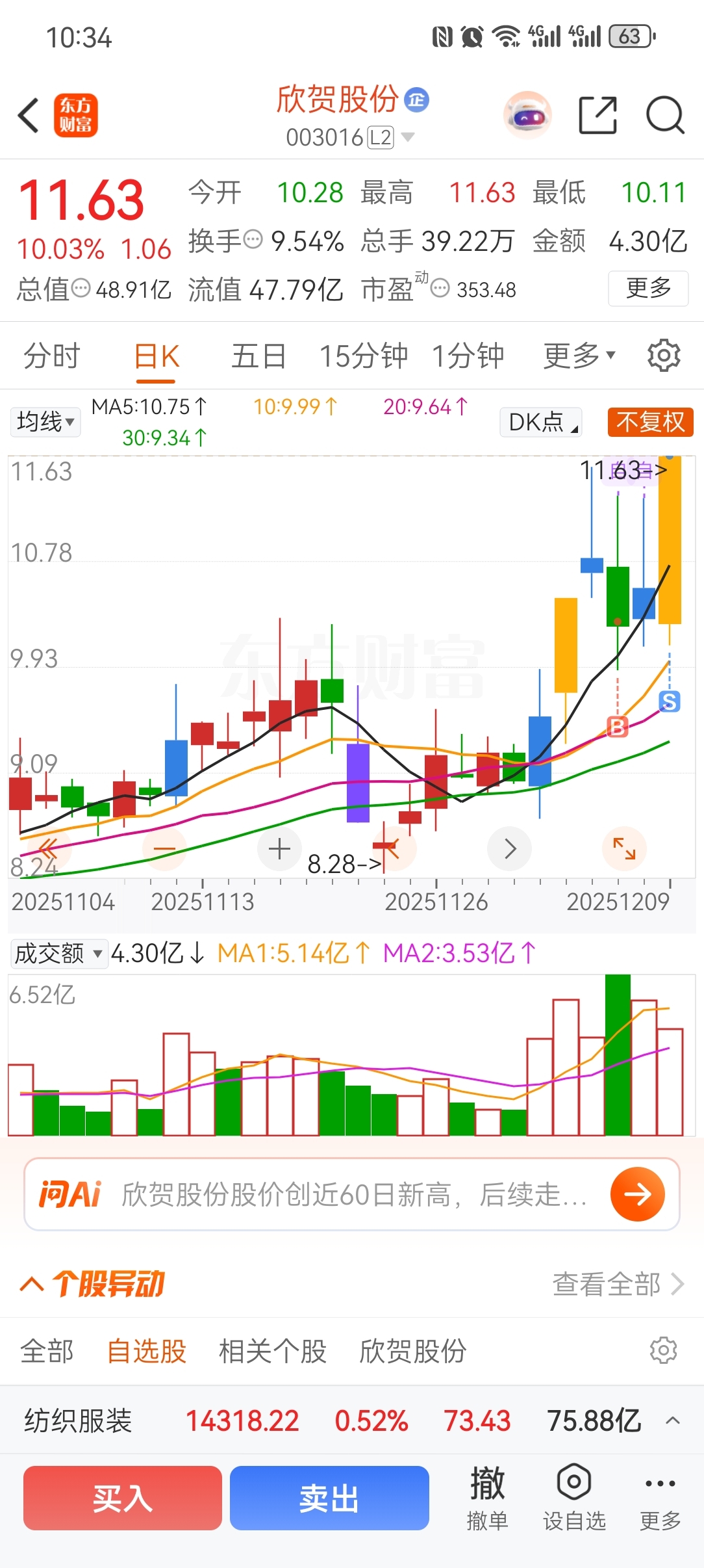$欣贺股份(SZ003016)$ 昨天板上没卖,亏了一天,今天给机会跑路,只要赚钱,什么时候卖都是对的,但是我感觉这个应该会连板的,不然今天没有必要拉涨停!