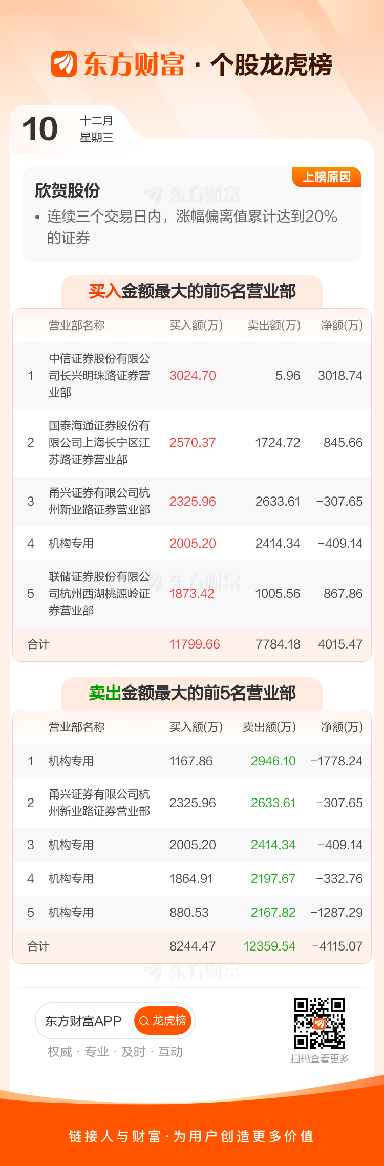 交易所2025年12月10日公布的交易公开信息显示,欣贺股份因成为连续三个交易日内,涨幅偏离值累计达到20%的证券上榜。欣贺股份当日收报12.79元,涨跌幅9.97%,换手率13.92%,成交额7.27亿。异常期间12月9日至12月10日,期间涨幅21.00%,累计偏离值21.26%,区间成交额12.61亿。