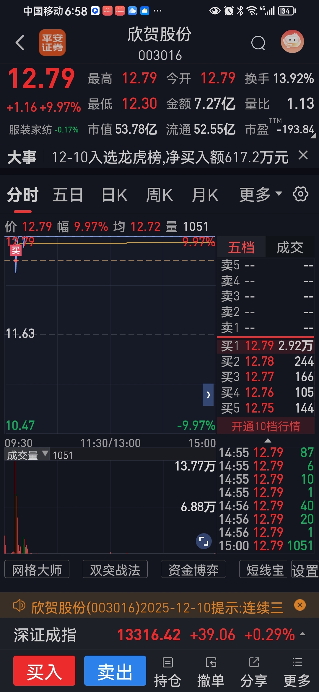 $欣贺股份(SZ003016)$ 上午炸板后直接上车了