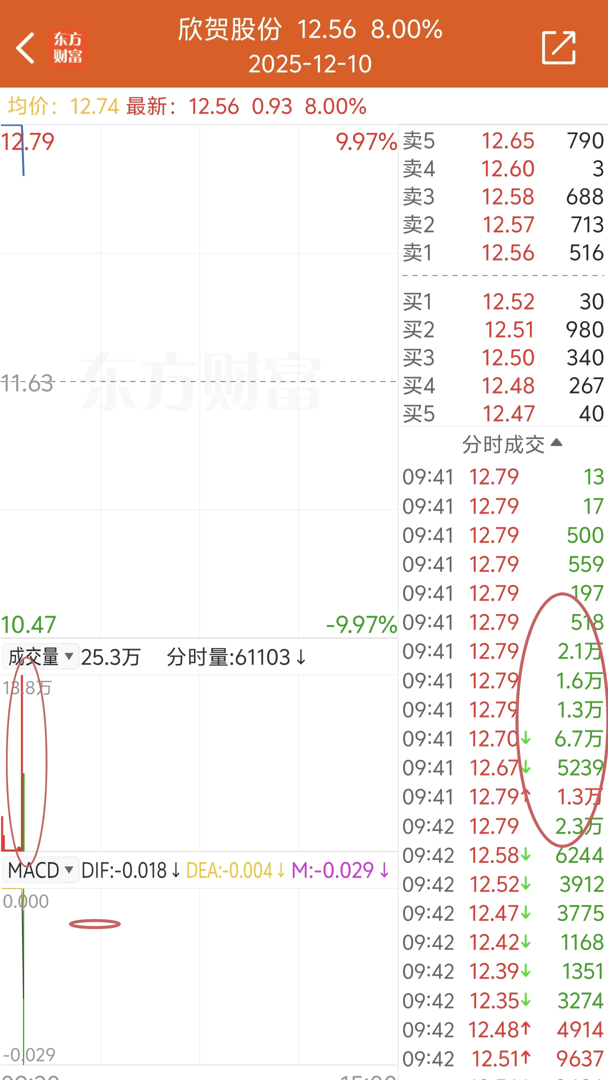 看12.10号,9:41-9:42分涨停板上两分钟,成交量瞬间15万手,一个多亿