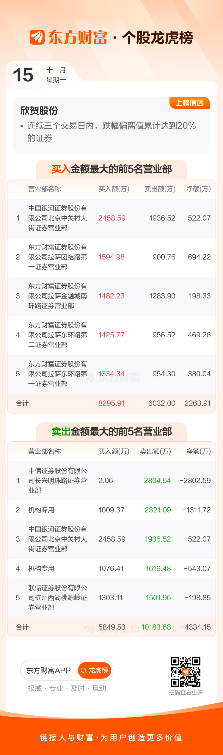 交易所2025年12月15日公布的交易公开信息显示,欣贺股份因成为连续三个交易日内,跌幅偏离值累计达到20%的证券上榜。欣贺股份当日收报9.55元,涨跌幅-7.82%,换手率9.02%,成交额3.59亿。异常期间12月11日至12月15日,期间涨幅-25.33%,累计偏离值-23.81%,区间成交额12.95亿。