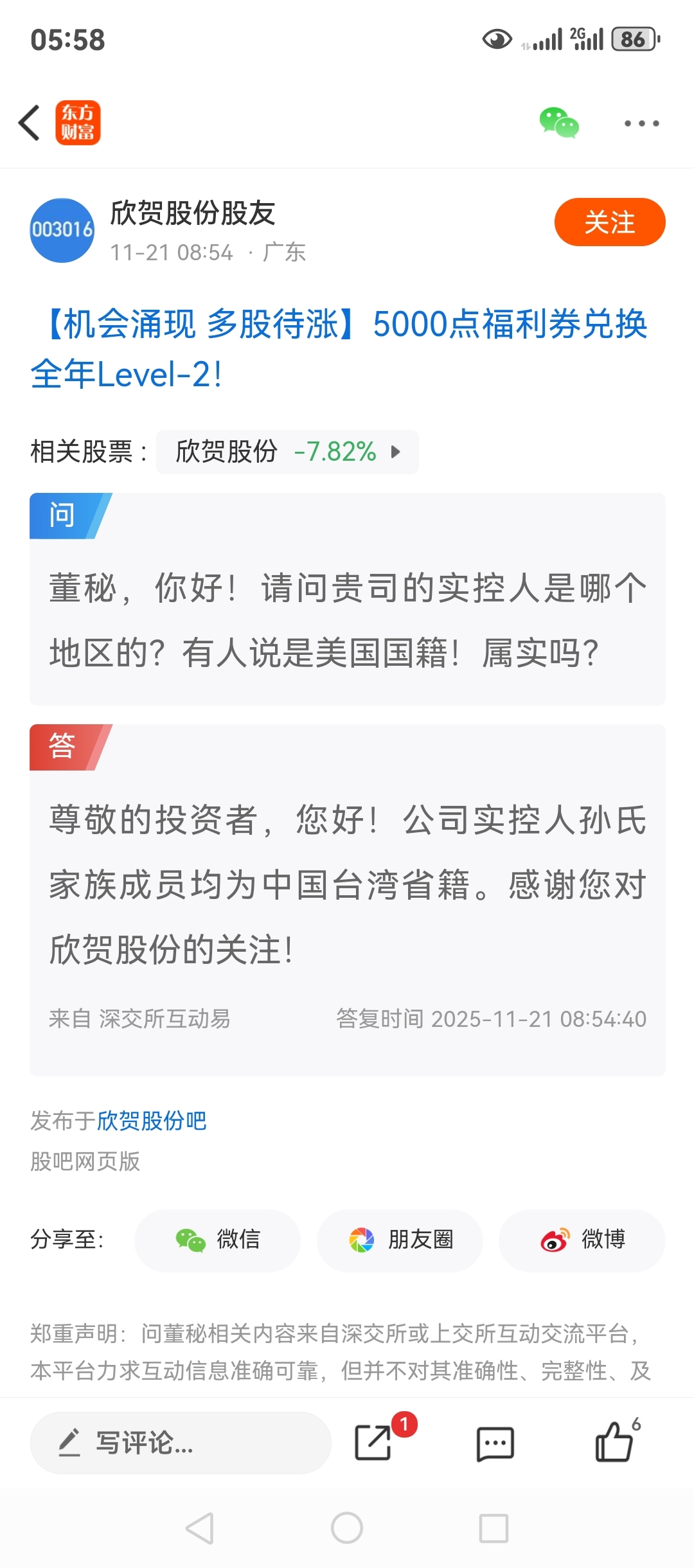 $欣贺股份(SZ003016)$ 福建省厦门-欣贺股份003016实际控制人台湾籍。