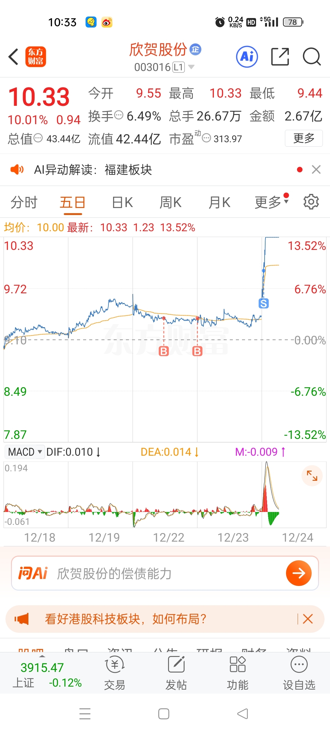 $欣贺股份(SZ003016)$ 有点操作,但是不多,又买飞一个板