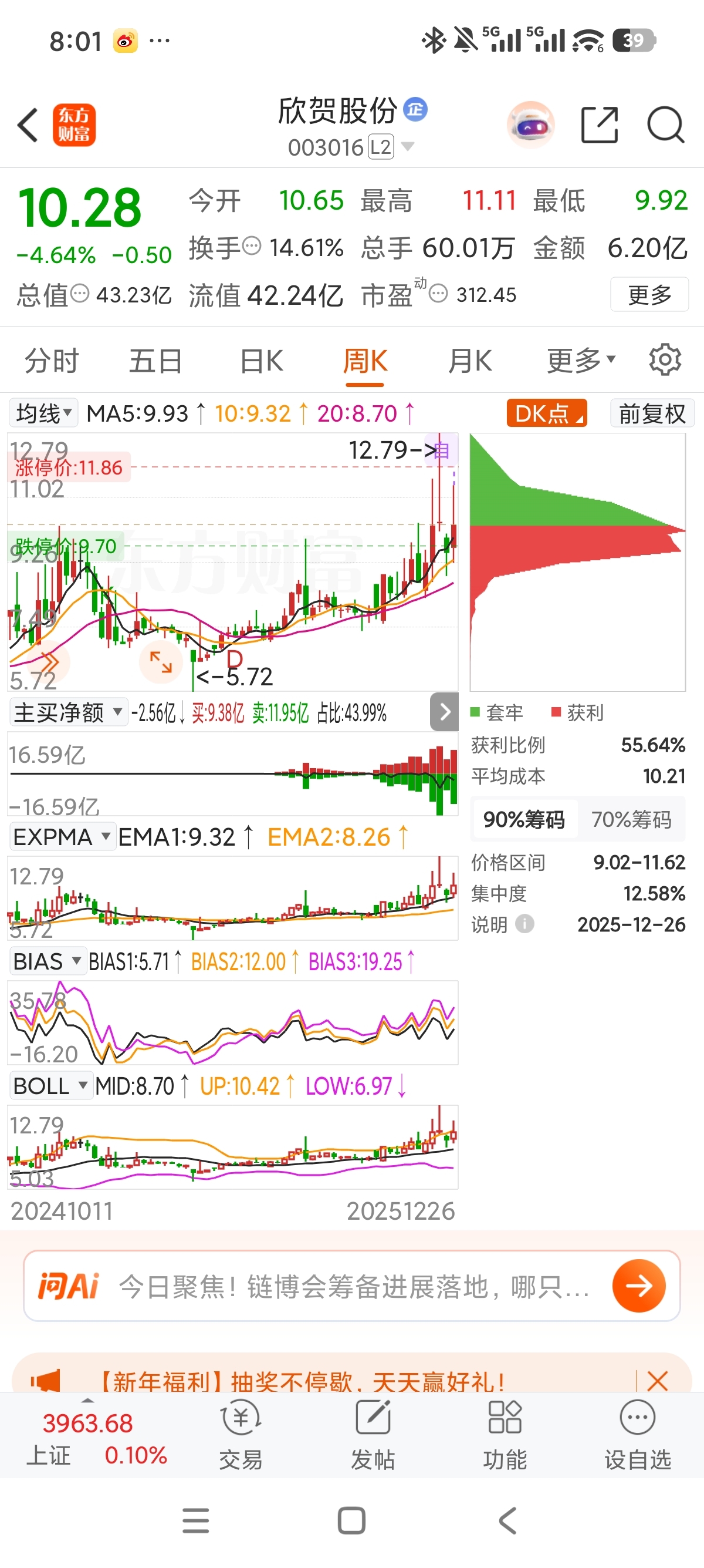 $欣贺股份(SZ003016)$ 很多庄股都是这走势。看周线没有三连板以上股性的基本上最多二连板的不要买。他们拉两个就会套人,然后盘整很长时间。