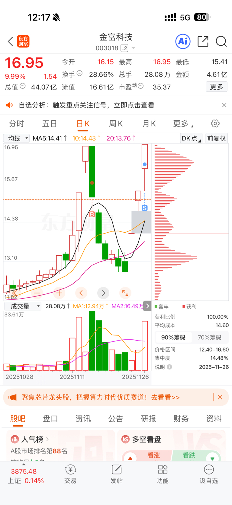$金富科技(SZ003018)$ 抗了将近三个跌停 今天+6%出了半仓
