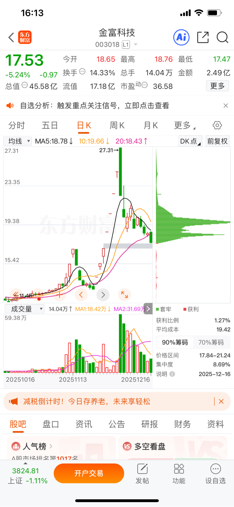 如图所示,今天并没有跌停,或许,某人还会蕴酿另一种恐吓股友的诡计。不过,大家不要害怕。因为,股价从二十七跌到十七,跌幅已经达到百分之四十,已经达到主力的极限。从某种角度来说,主力也是人,也有物理和精神底线。如果说,再继续打压股价,那么疯的先是主力自己。大家想想这可能吗?!并购题材这么好,整个投资界人士都在翘首以待,没有理由无限制打压股价。因为,这会适得其反…只剩三天时间了。不出意外,今天的最低价就是这次收购公告发布前的最低价。老胡认为,明天,后天,大后天不会再跌破这个价位。理由就是大消费时代来临了…如果说,最高当局的政治决心还读不懂,那么主力基本上就废了!记住,金富科技从名字到业务再到发展空间都做到与时俱进。弟兄们,紧跟时代脚步既是历史使命,也是责任担当。我们决不能容忍任何退缩不前…对于那些恶意看空中国股票和市场潜力的别有用心者一定要保持警惕!