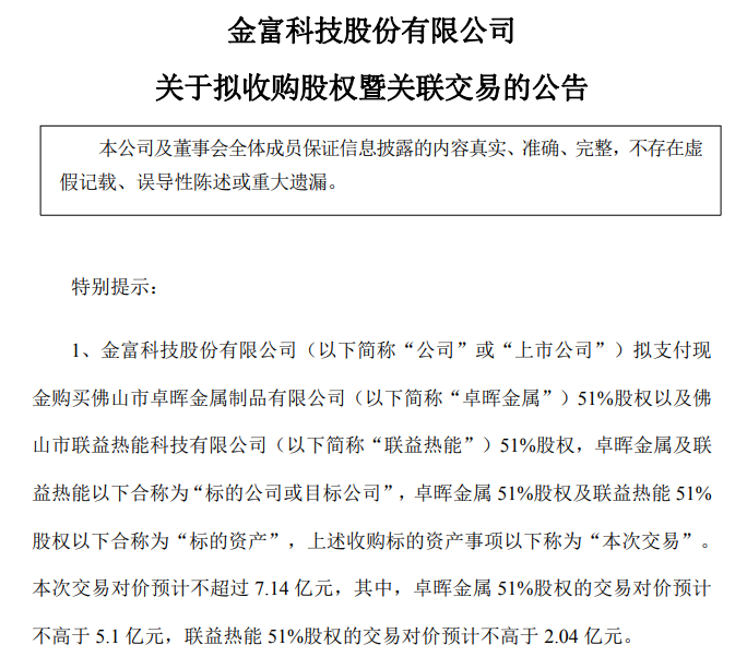 公告介绍,公司拟支付现金购买佛山市卓晖金属制品有限公司(以下简称“卓晖金属”)51%股权以及佛山市联益热能科技有限公司(以下简称“联益热能”)51%股权,卓晖金属及联益热能以下合称为“标的公司或目标公司”,卓晖金属51%股权及联益热能51%股权以下合称为“标的资产”,上述收购标的资产事项以下称为“本次交易”。本次交易对价预计不超过7.14亿元,其中,卓晖金属51%股权的交易对价预计不高于5.1亿元,联益热能51%股权的交易对价预计不高于2.04亿元。