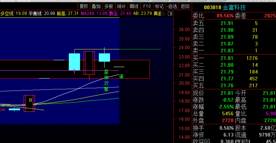 $金富科技(SZ003018)$ 金富科技低开在开盘价下方买入,打压到平衡线位置处,以实际的盘面低吸,今天有机会再次回升,冲击前面高点