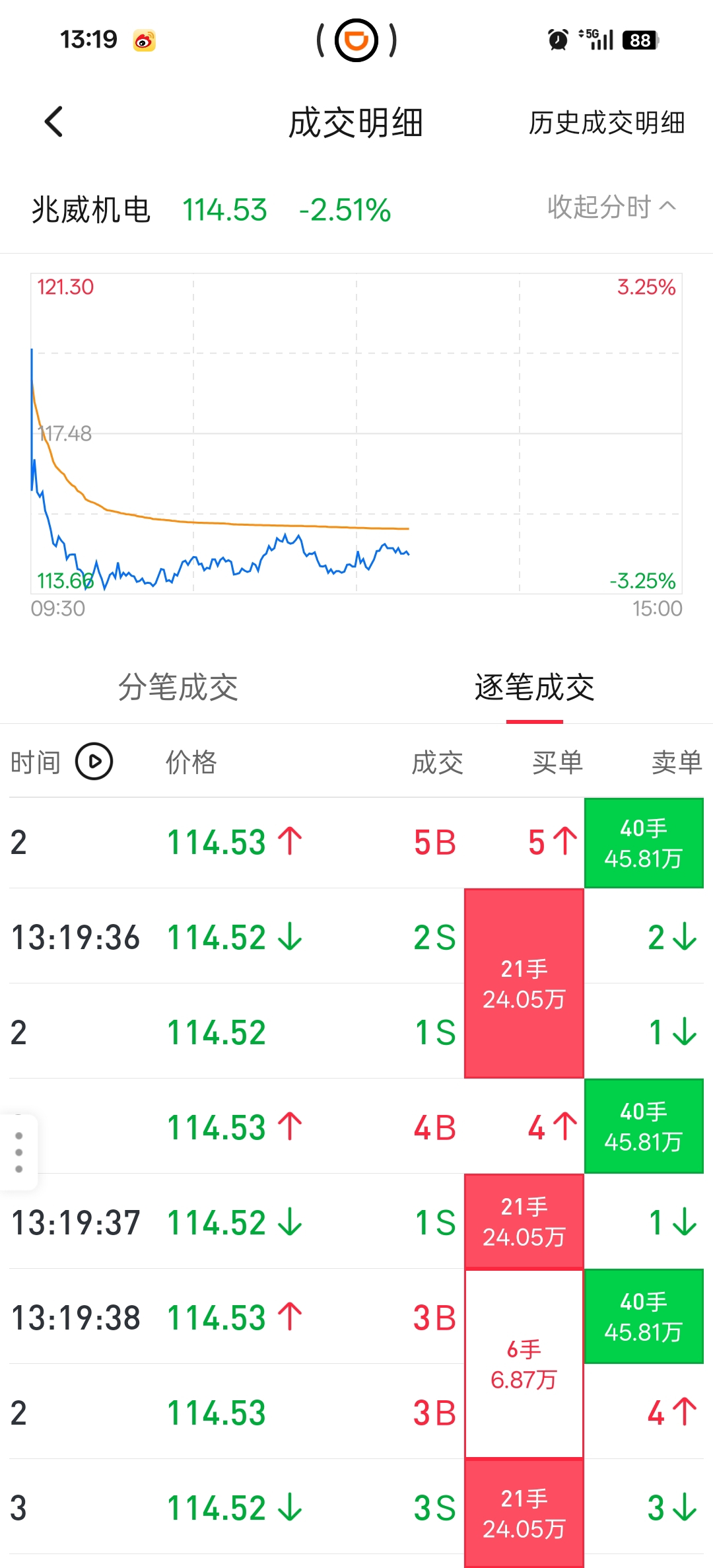 $兆威机电(SZ003021)$ 量化操盘,40手卖,21手买,左右互倒