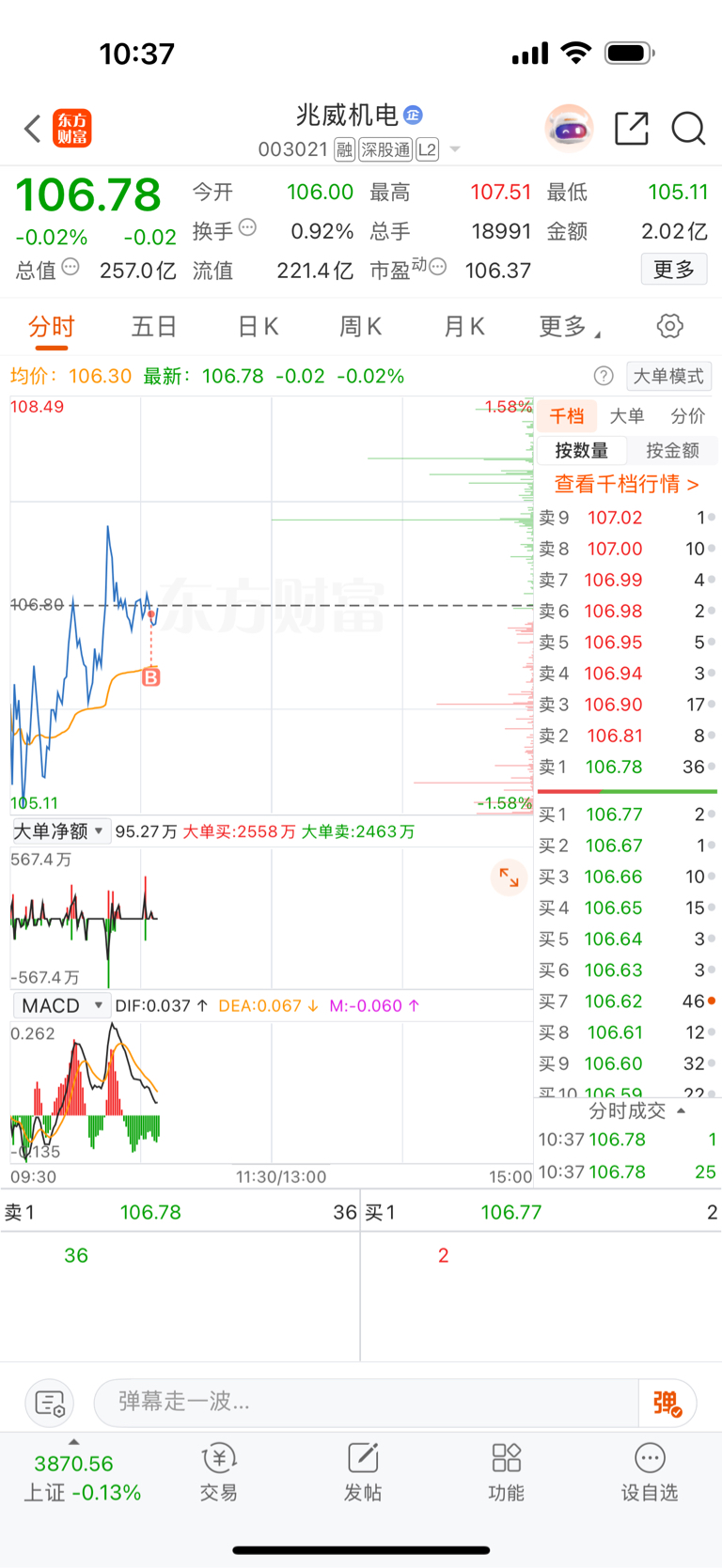$兆威机电(SZ003021)$ 早盘没来及买,不等了,先追一笔。这两天机器人普涨,这个还没涨,机器人低位启动,不可能一天就歇菜,这个半月内必有中大阳