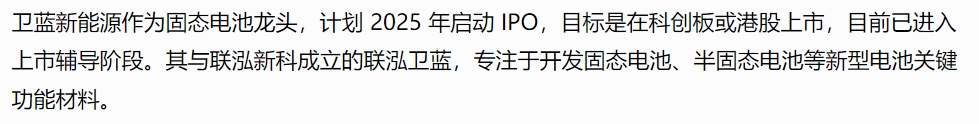 卫蓝新能源作为固态电池龙头,计划 2025 年启动 IPO,目标是在科创板或港股