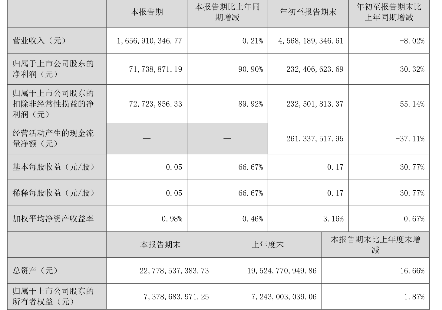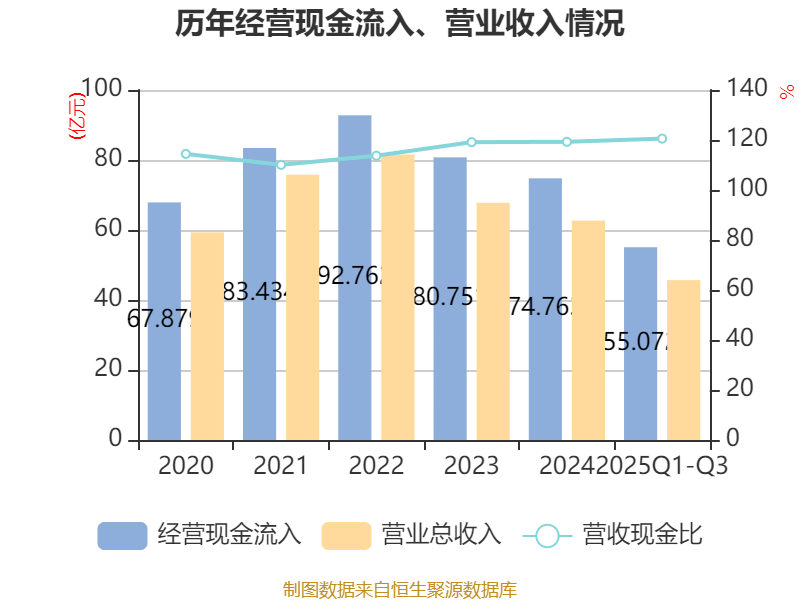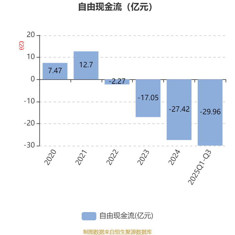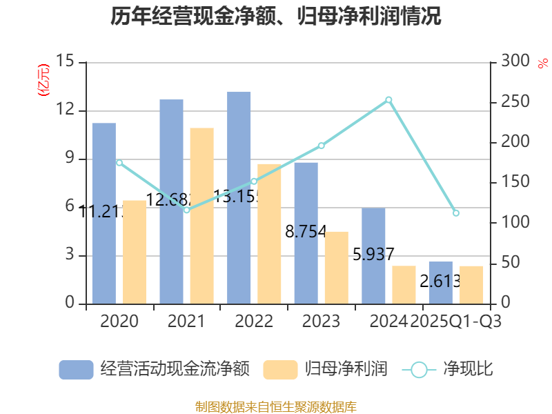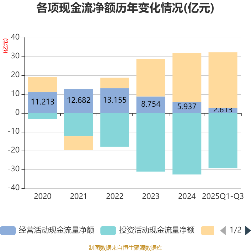 2025年前三季度,公司经营活动现金流净额为2.61亿元,同比下降37.11%;筹资活动现金流净额29.6亿元,同比增加11.35亿元;投资活动现金流净额-29.35亿元,上年同期为-23.12亿元。