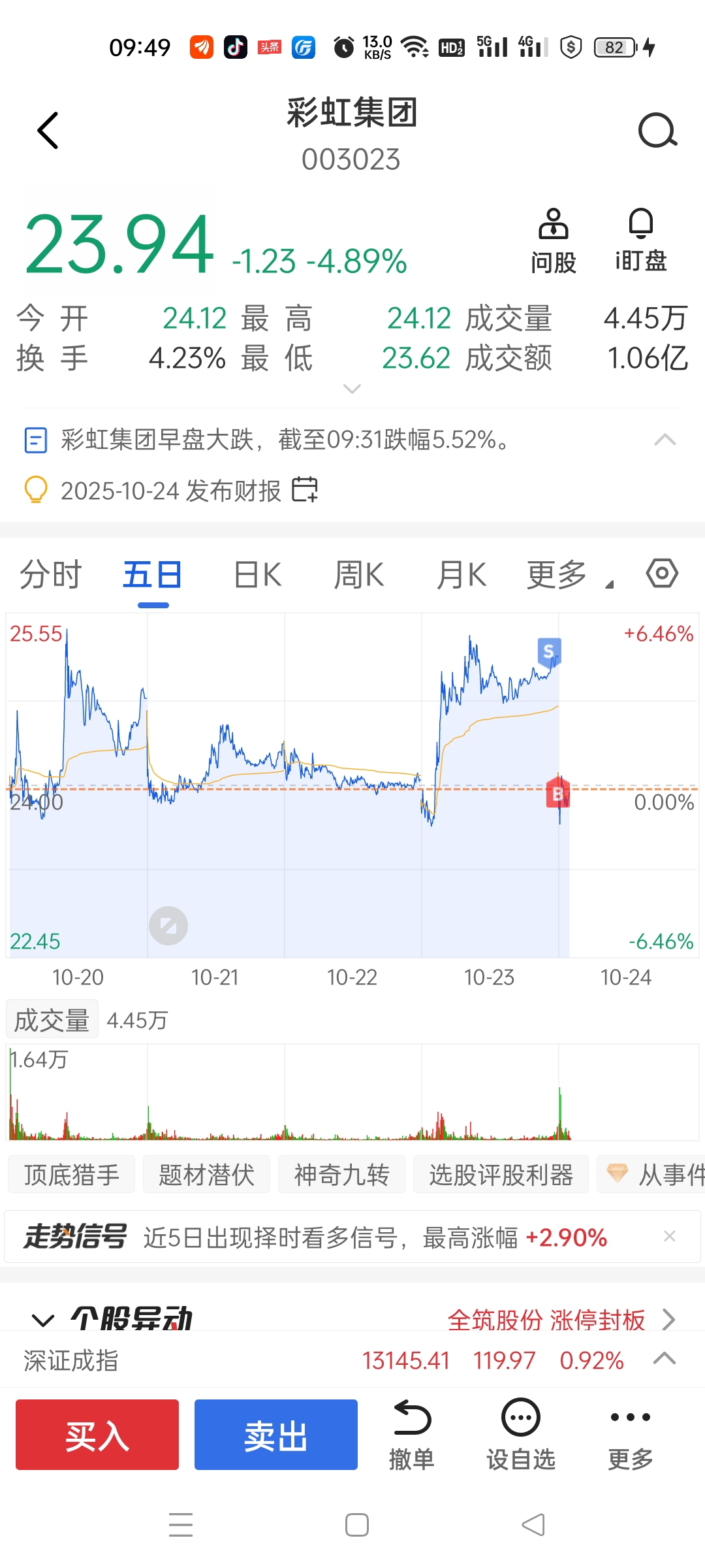 $彩虹集团(SZ003023)$ 跟紧庄家节奏