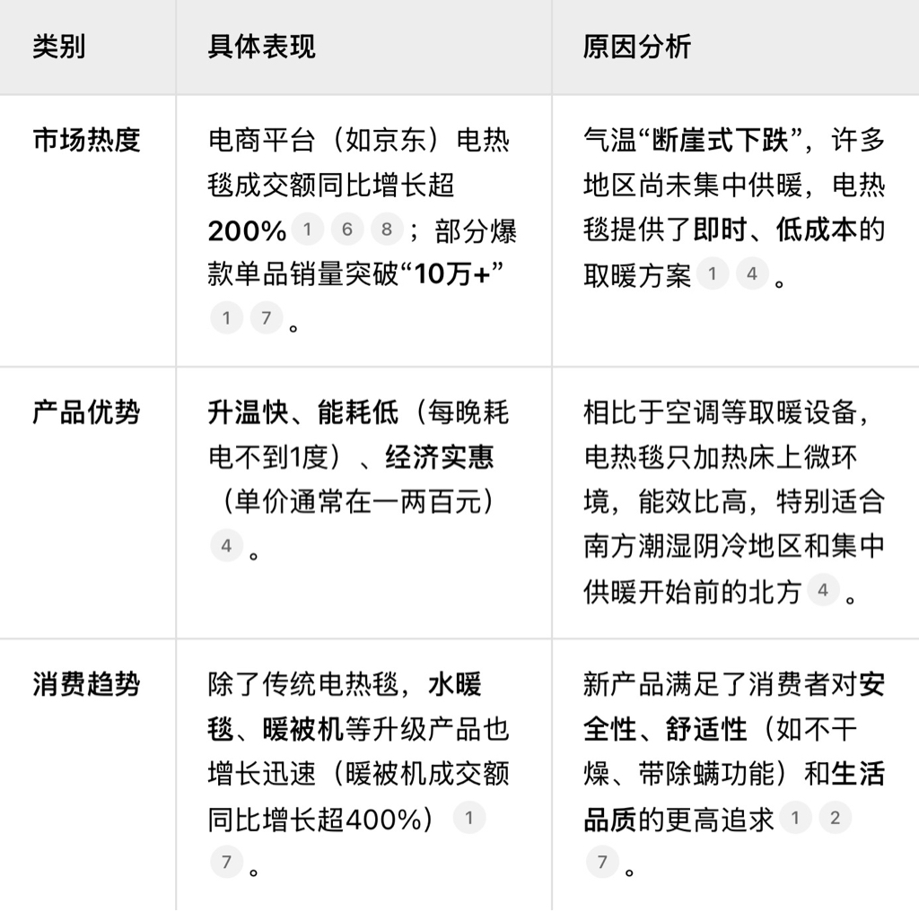 电热毯销售确实出现显著增长,特别是京东平台的数据显示成交额同比增长超过200%。