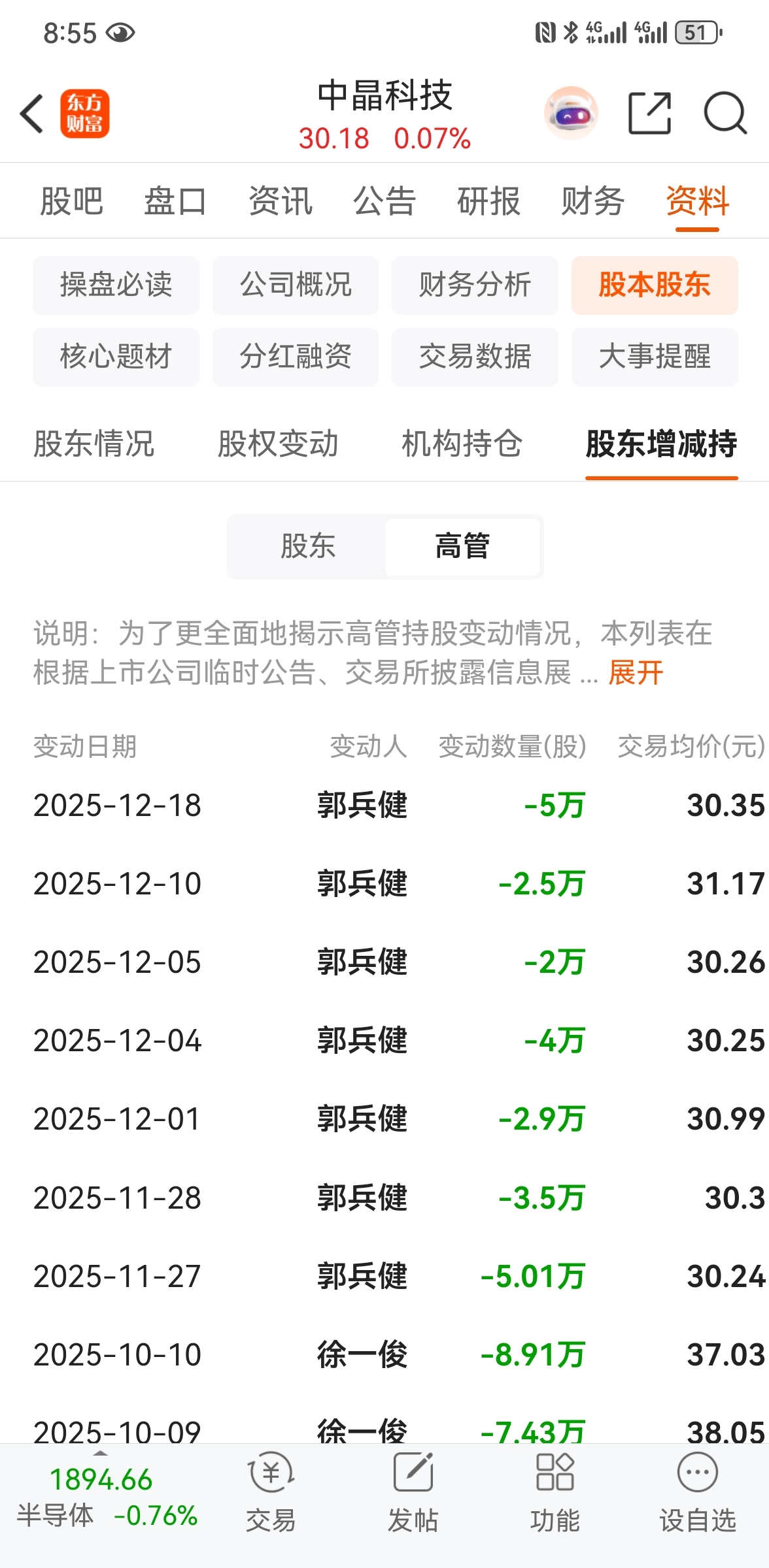 $中晶科技(SZ003026)$ 郭总又跑了五万股,天天盯着股价也不用上班,只要价格低于30就不减,超过30立马减。比散户还鸡贼