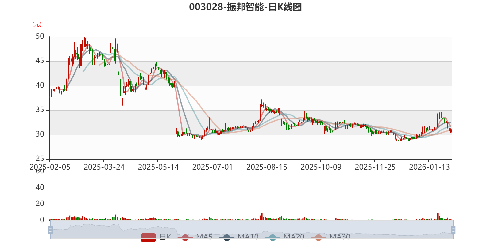 中证智能财讯振邦智能(003028)1月30日晚间披露2025年度业绩预告,预计2025年归母净利润6500万元至8000万元,同比下降60.65%-68.03%;扣非净利润预计6400万元-7900万元,同比下降59.6%-67.27%;基本每股收益0.45元/股-0.55元/股。以1月30日收盘价计算,振邦智能目前市盈率(TTM)约为56.15倍-69.11倍,市净率(LF)约2.56倍,市销率(TTM)约3.25倍。