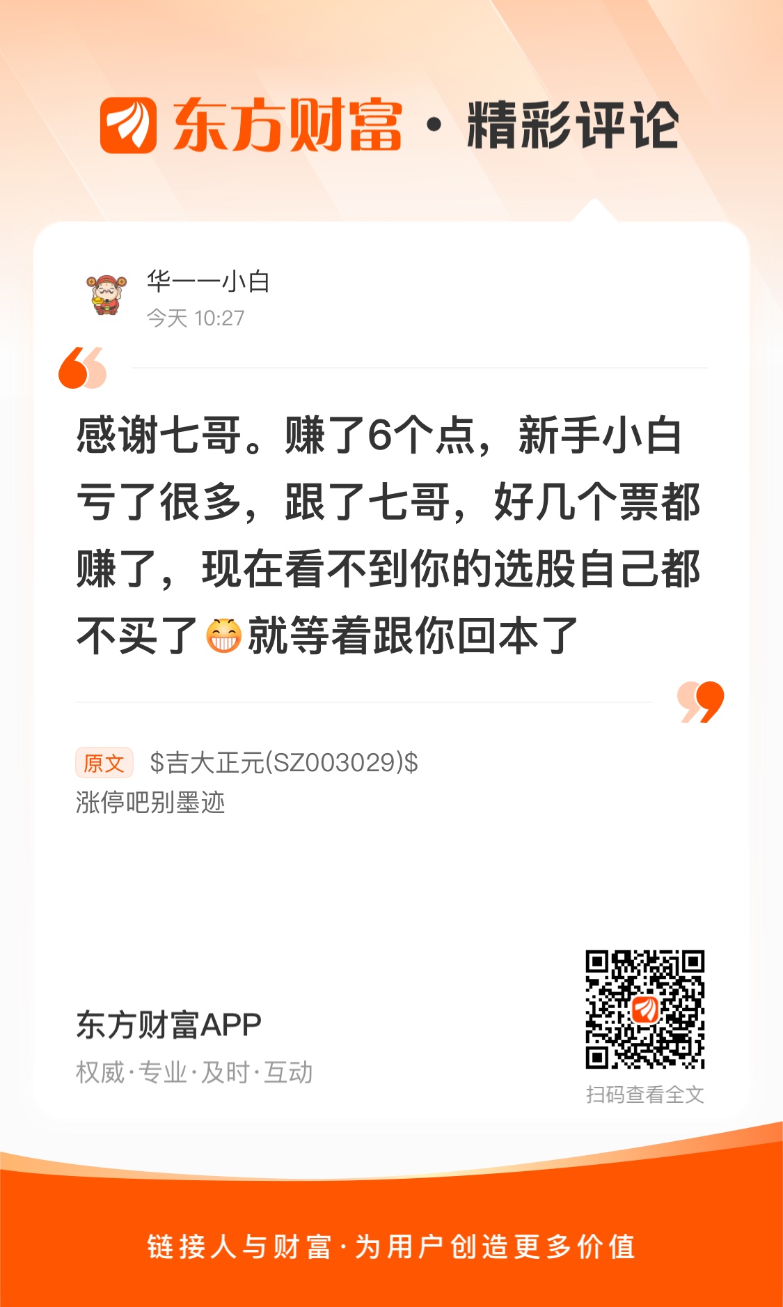 这是一个正常思维的炒股朋友。现在你是小白。多看我选的股琢磨我的选股思维和买入点模式。你也会成为高手//@华一一小白 : 感谢七哥。赚了6个点,新手小白亏了很多,跟了七哥,好几个票都赚了,现在看不到你的选股自己都不买了
