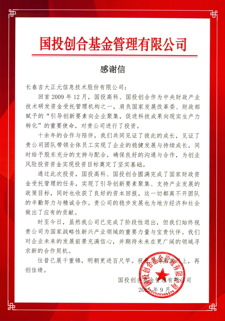 国投创合基金发来感谢信,回顾双方合作历程,对吉大正元十余年来的稳健发展、对股东的