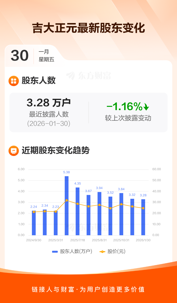 吉大正元:截至1月30日最新股东户数3.28万户,较上期减少1.16%