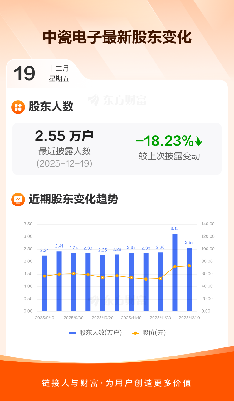 中瓷电子:截至12月19日最新股东户数2.55万户,较上期减少18.23%