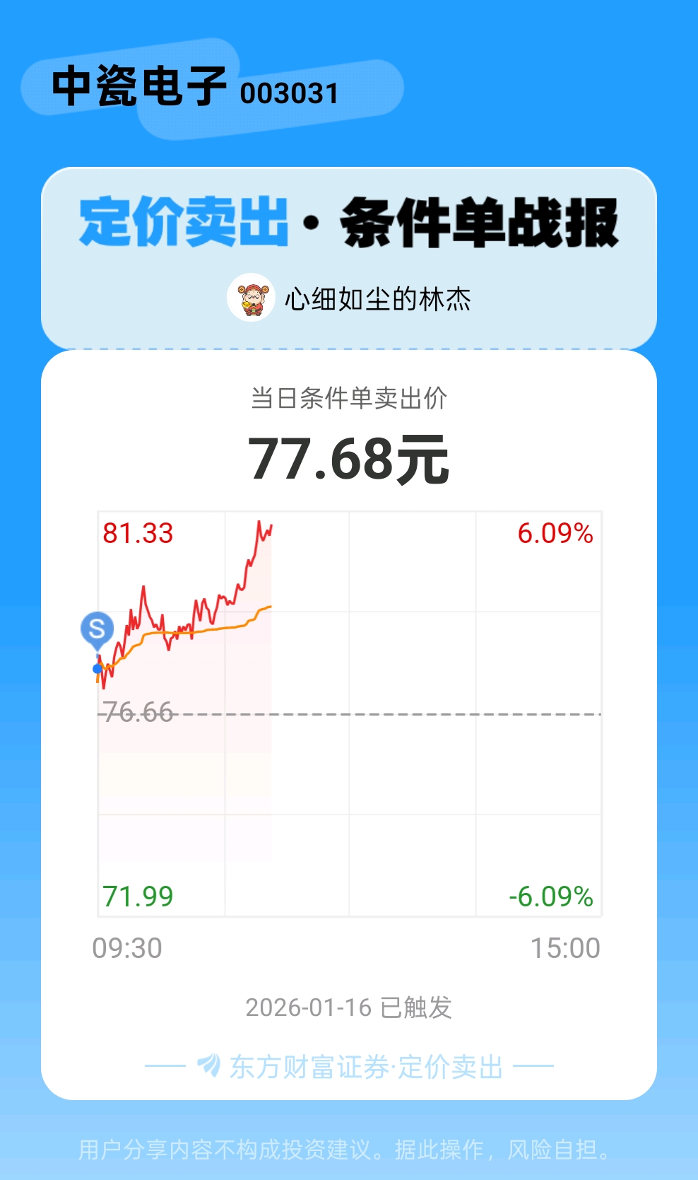 #条件单交流# #定价卖出晒单# 我方派出一个定价卖出条件单,立时就征服了$中瓷电子(SZ003031)$