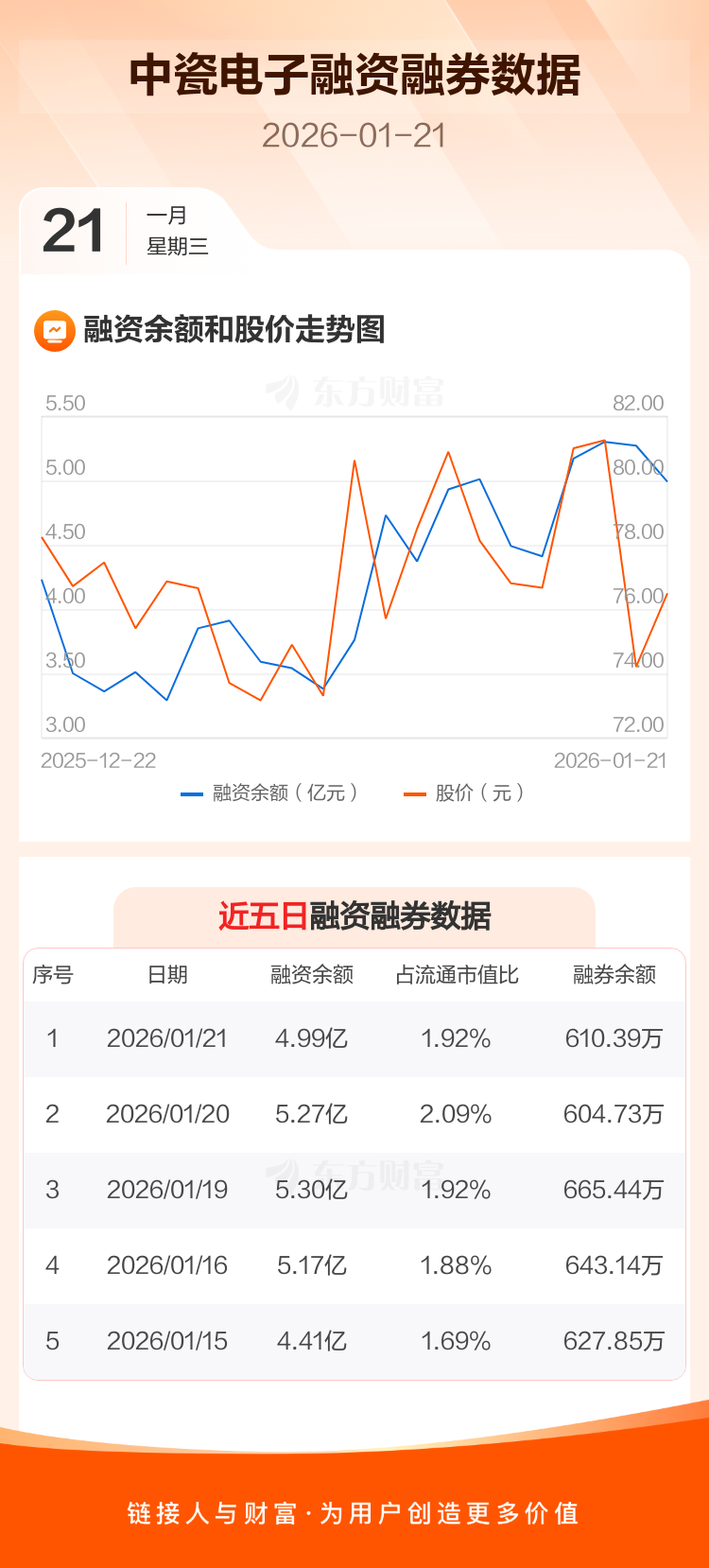 交易所最新数据显示,中瓷电子于2026年1月21日获融资买入4374.13万元,融资偿还7234.61万元,当日融资净偿还2860.48万元。目前,该股融资余额4.99亿,占流通市值比例为1.92%。