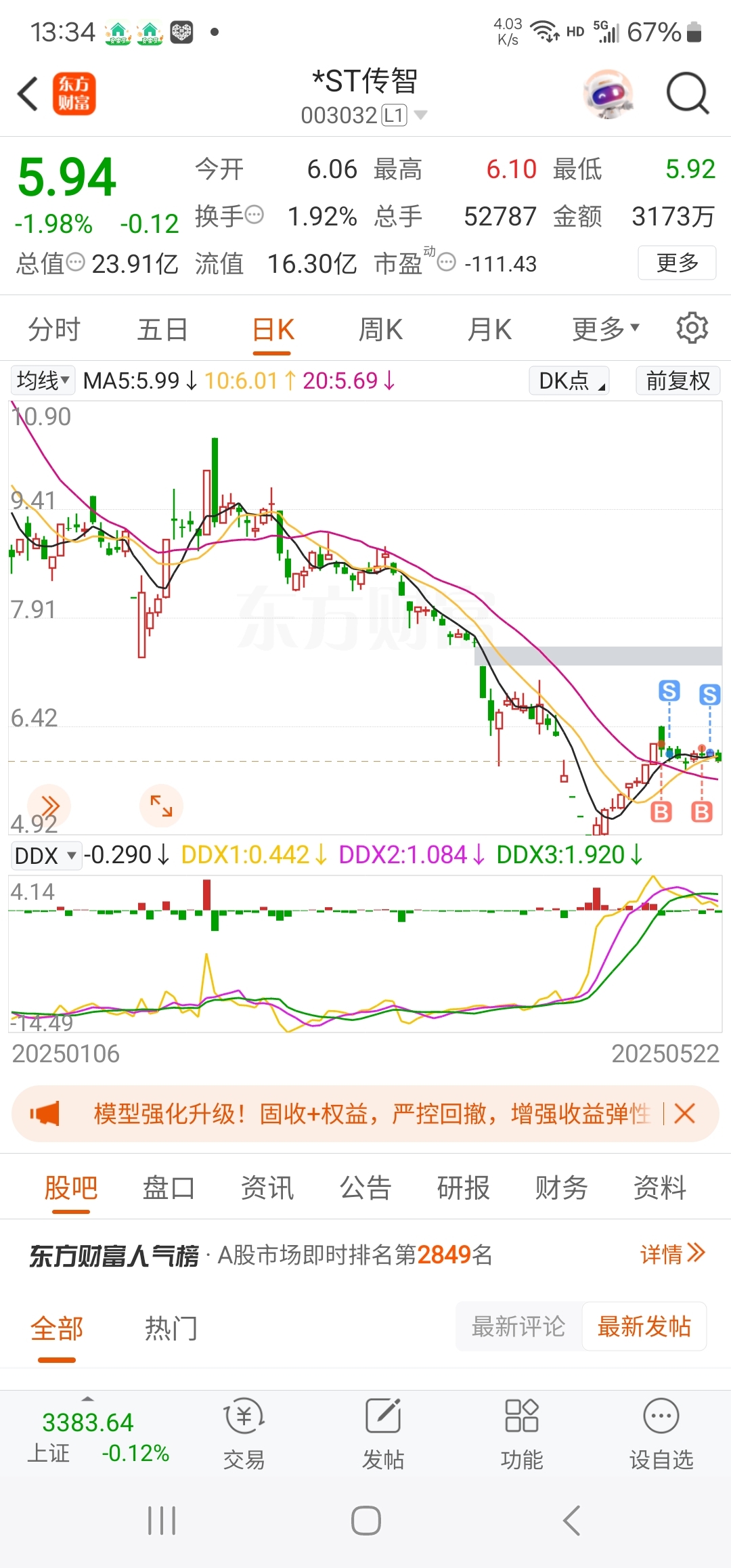 $*ST传智(SZ003032)$ 老夫在您这个票两进两出,真的是没有赚你1毛钱,还倒贴了100多块钱。