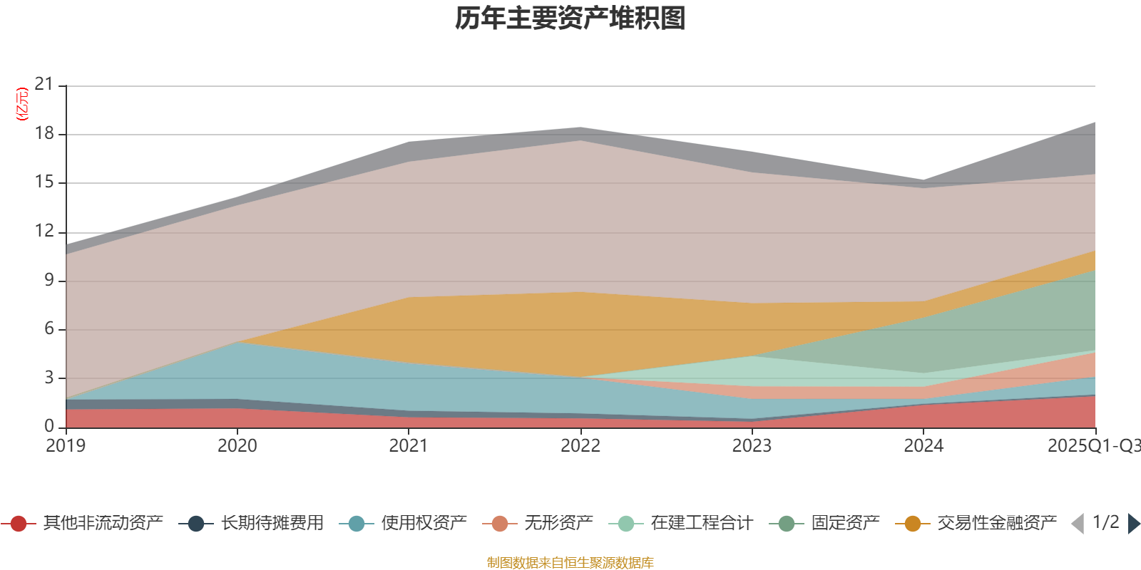 资产重大变化方面,截至2025年三季度末,公司货币资金较上年末减少32.5%,占公司总资产比重下降20.68个百分点;商誉占公司总资产的4.91%,上年末为0;在建工程合计较上年末减少82.87%,占公司总资产比重下降4.69个百分点;使用权资产较上年末增加262%,占公司总资产比重上升3.84个百分点。