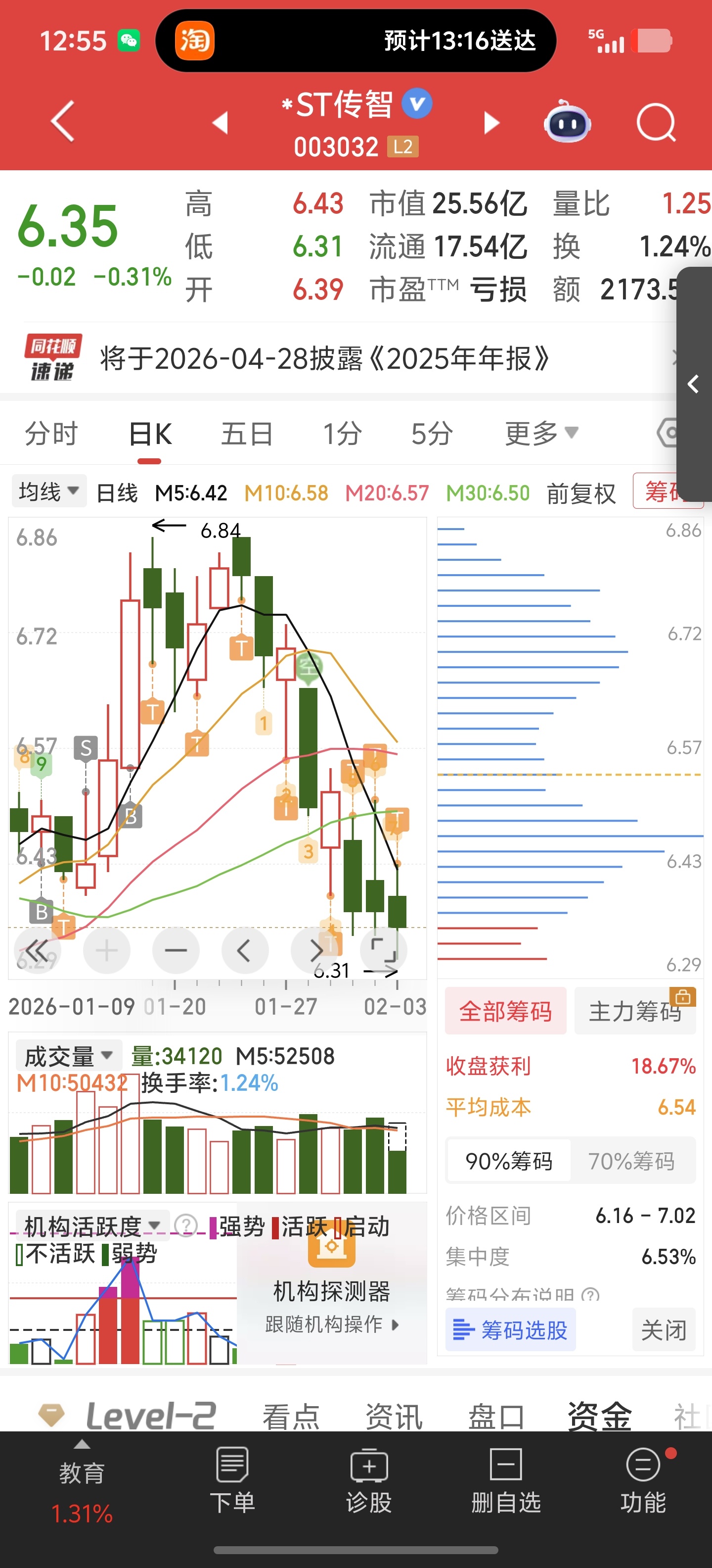 $*ST传智(SZ003032)$ 我黏在传智了,天天都是这套路,哪天能高开高走把我洗下车啊,天天高开低走,每一天走势都是上午涨,下午跌