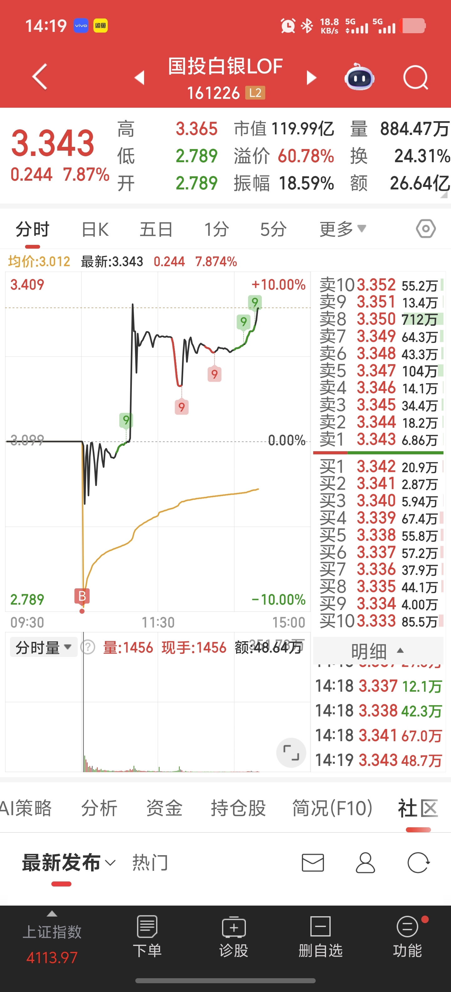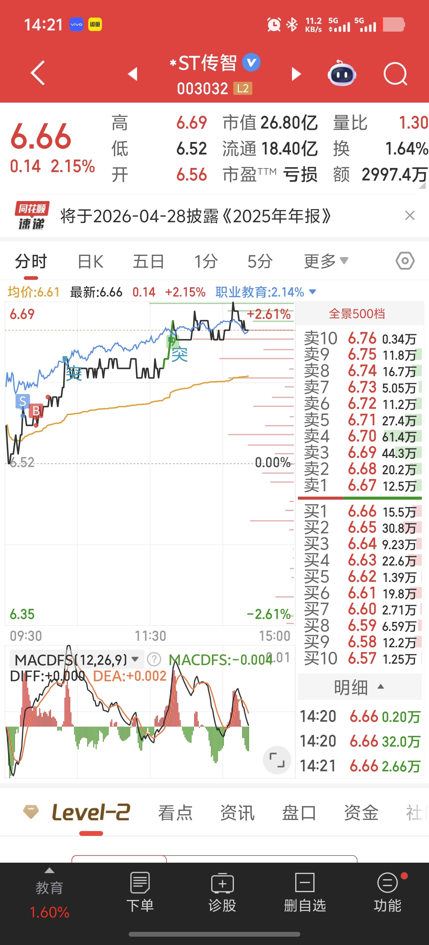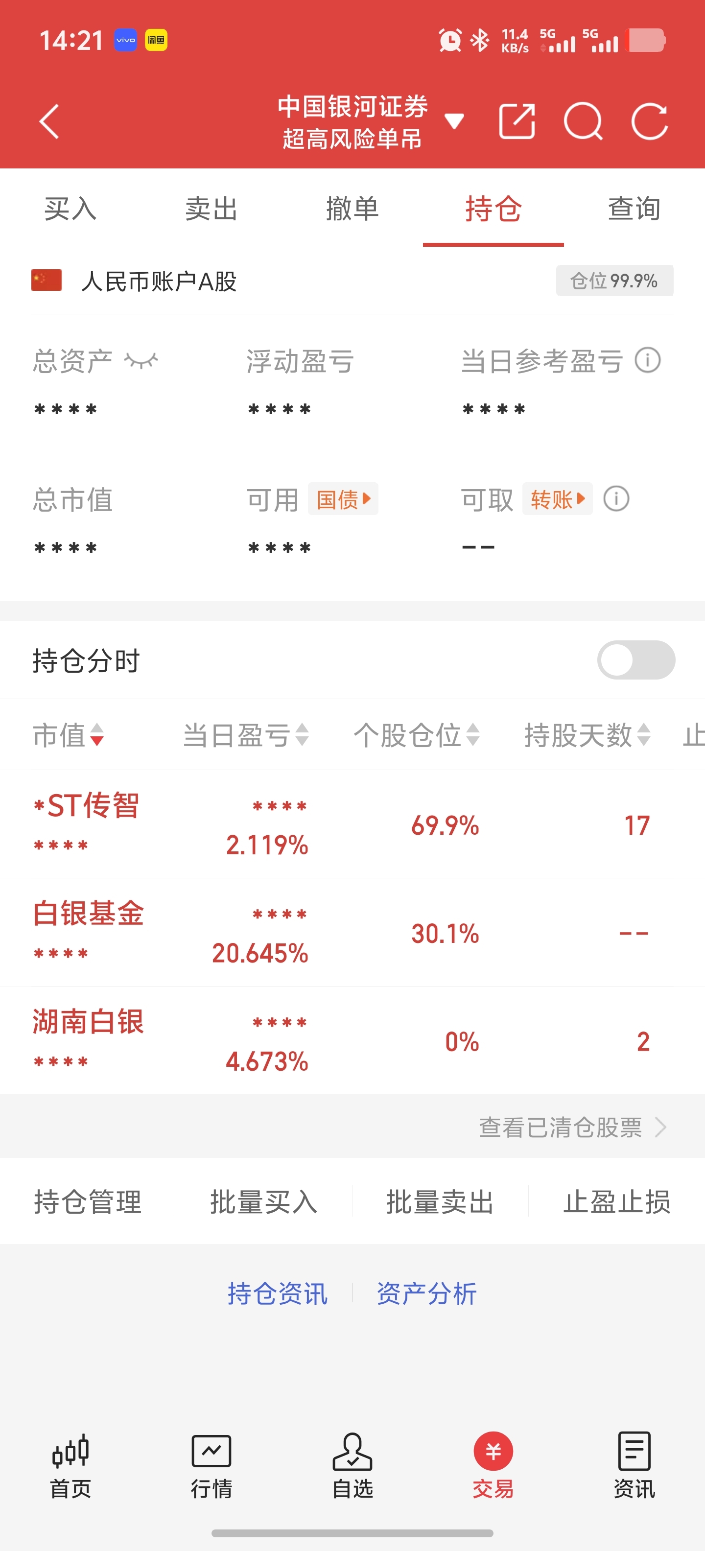 $*ST传智(SZ003032)$ 开盘五分钟清了湖南白银,一卖就拉,后面看期货大涨,也是十点半留了点仓位干白银lof去了,明天应该会回撤五个点,传智这几天不能动了,指不定哪天就涨停,今天做了个反t拉高了0.3分