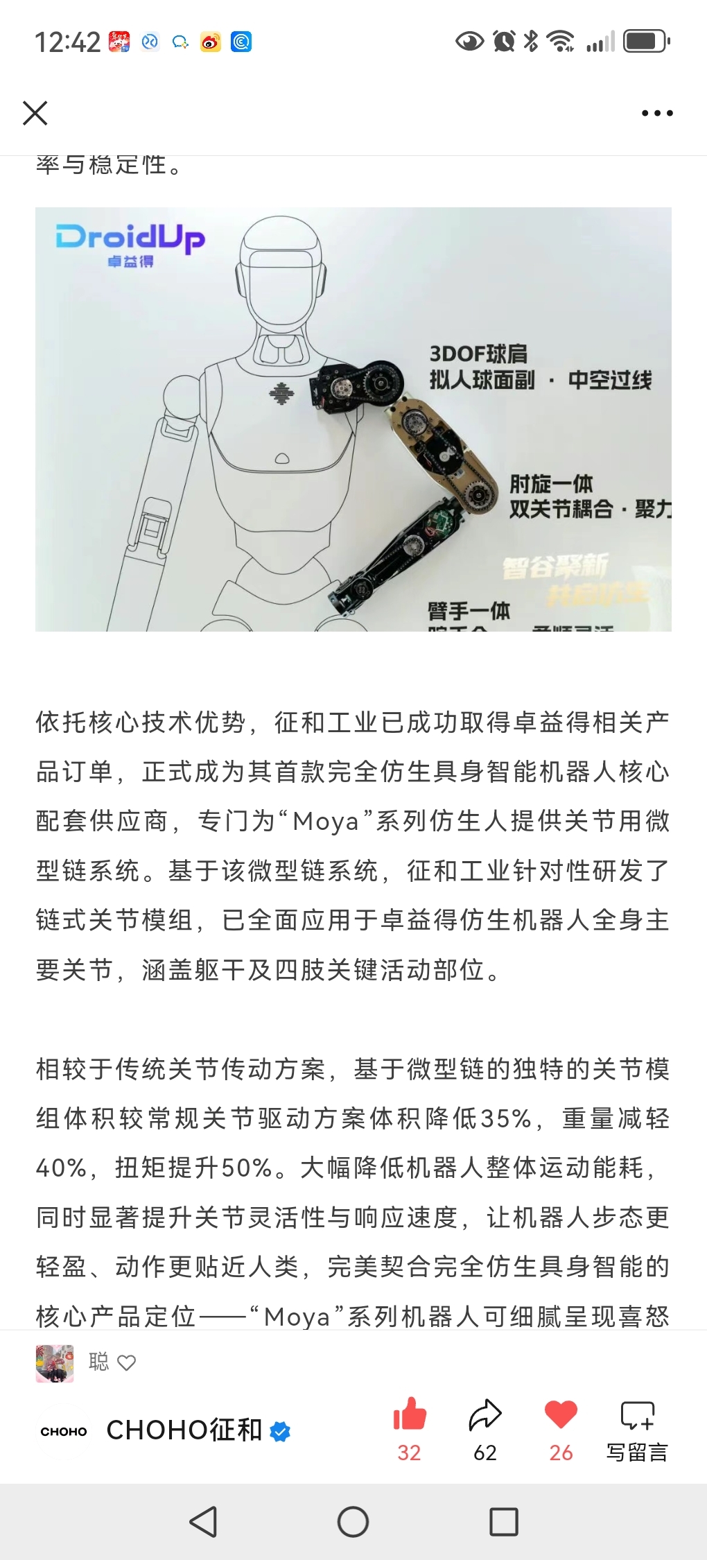 征和工业针对性研发了链式关节模组,已全面应用于卓益得仿生机器人全身主要关节,涵盖躯干及四肢关键活动部位